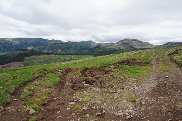 Au fond, le Puy Chavaroche à droite, mais aussi le Roc des Ombres, le Puy d'Orset et la Roche Taillade, à gauche.