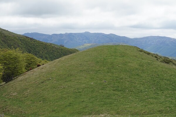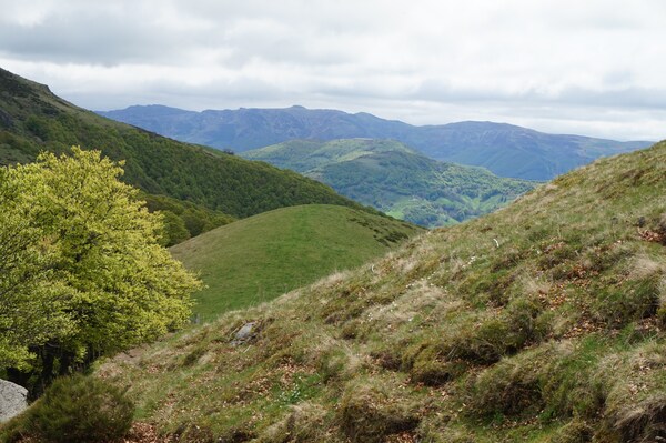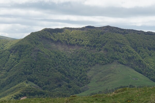 à droite du centre, le relief partiellement déboisé au bord du col de Légal, mon