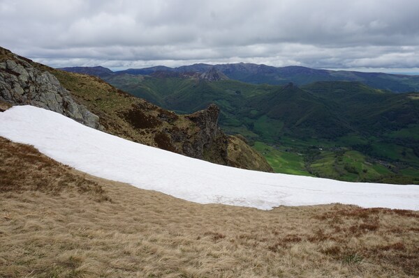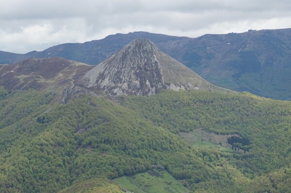 Sous cet angle, on distingue une petite zone rocheuse à nu au sommet du Puy Bassiérou, à l'arrière-plan.