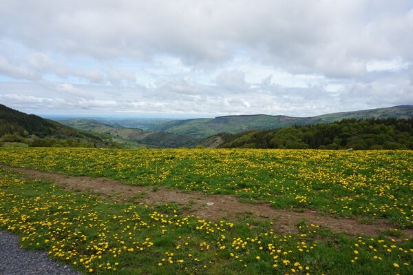 Derrière les pissenlits se trouve la vallée de la Bertrande, laquelle a par