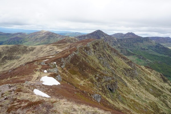 Sur la gauche, la bosse de la Chapeloune. Tout à gauche, le Puy de la Tourte. Au centre, le Puy Mary, et à droite, le Puy de Peyre Arse.