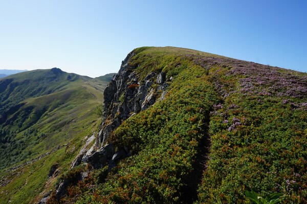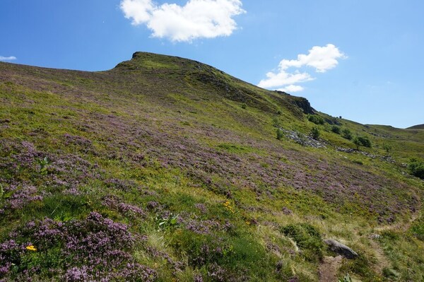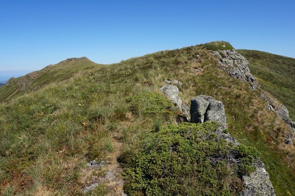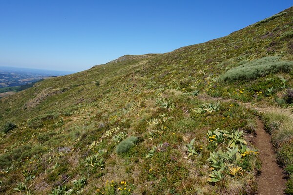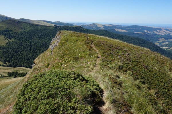 J'arrive en vue du sommet de la Chapeloune. Au loin à gauche, le Puy Chavaroche.