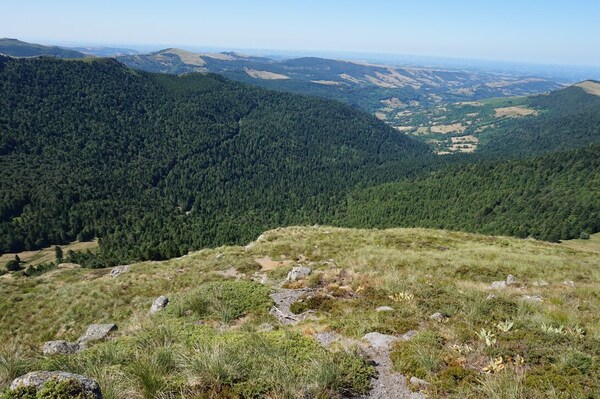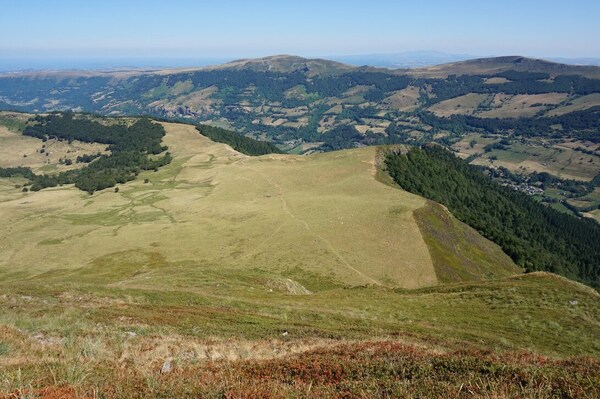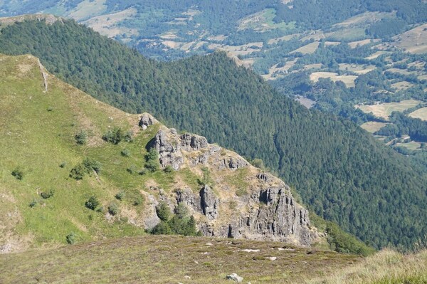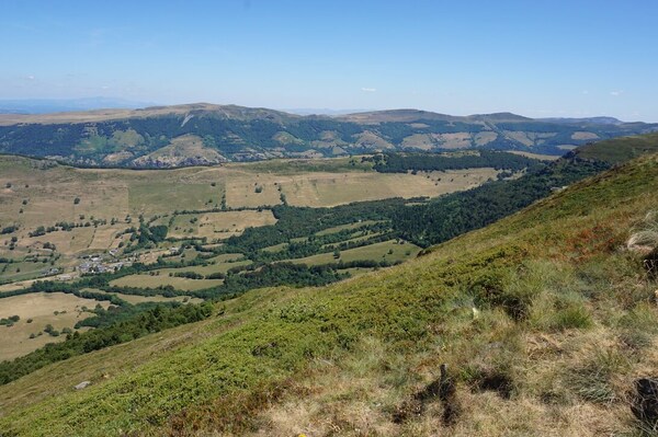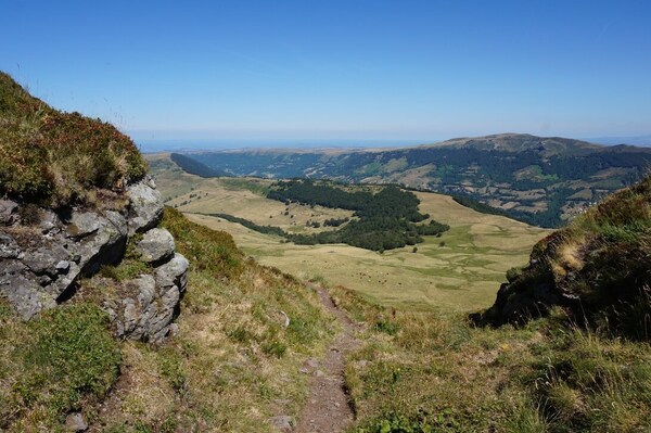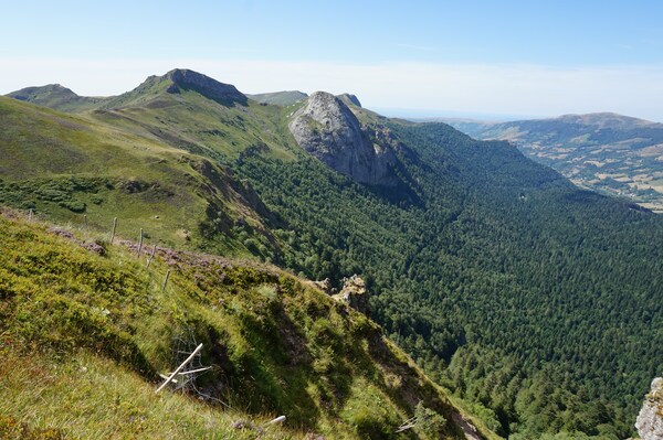 Face à la Roche Noire, la verdoyante vallée du Mars. Au centre, au loin, le Suc
