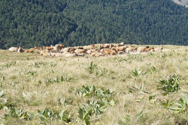 Je repasse à proximité des vaches en train de bronzer. Au fond, la crête du Puy