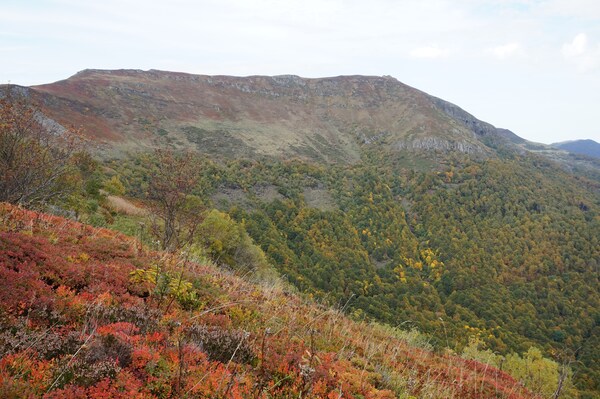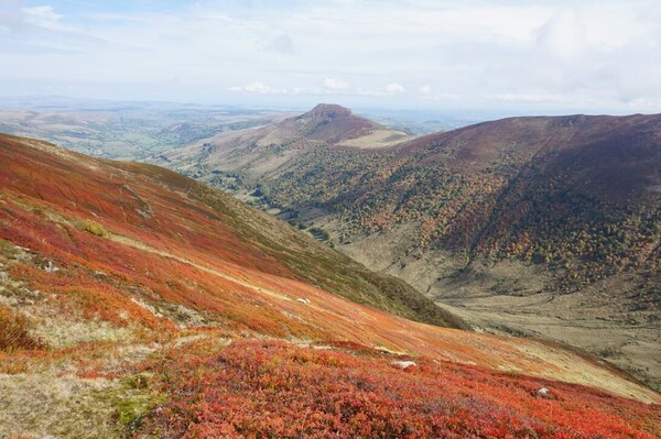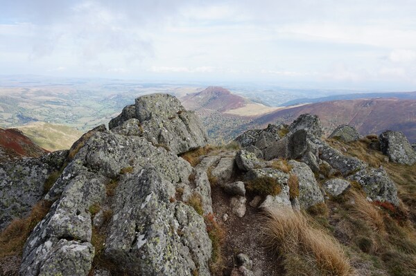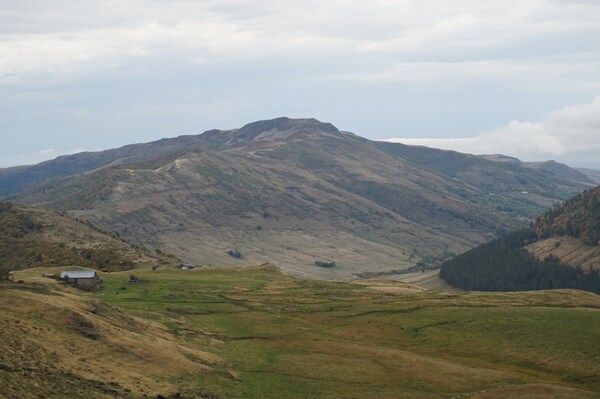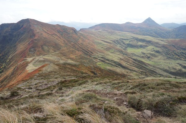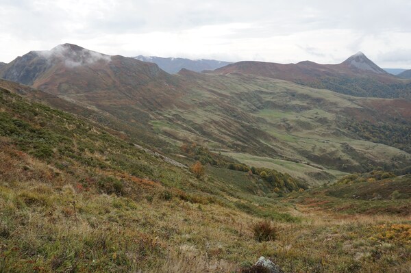 Entre le Puy Bataillouse et le Puy Griou, au loin, la crête du Plomb du Cantal,