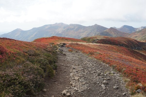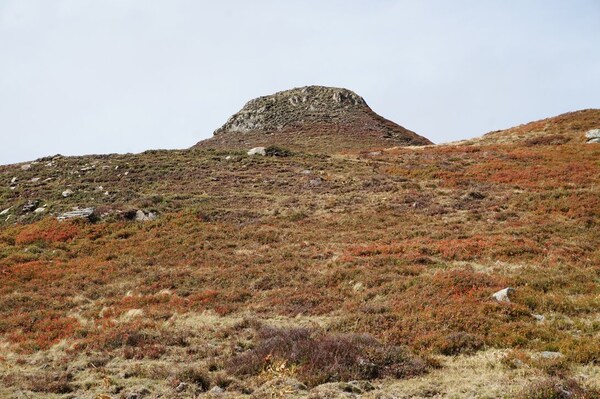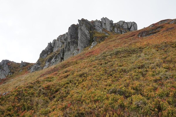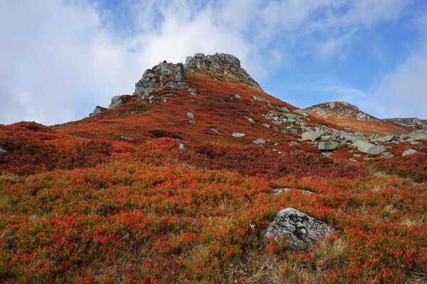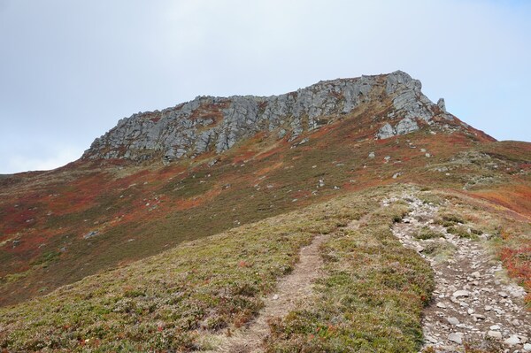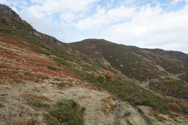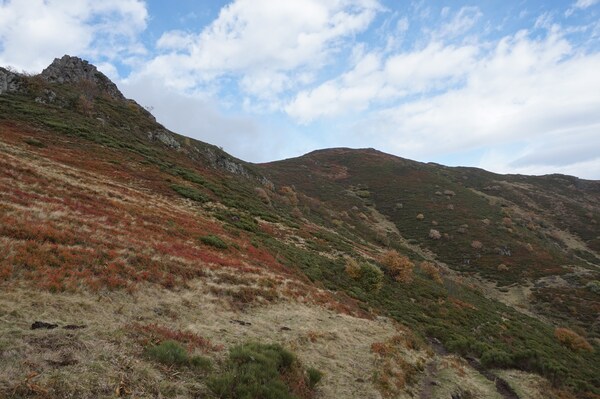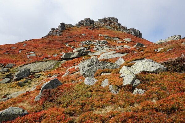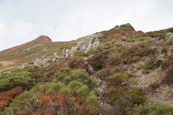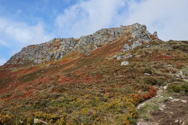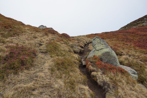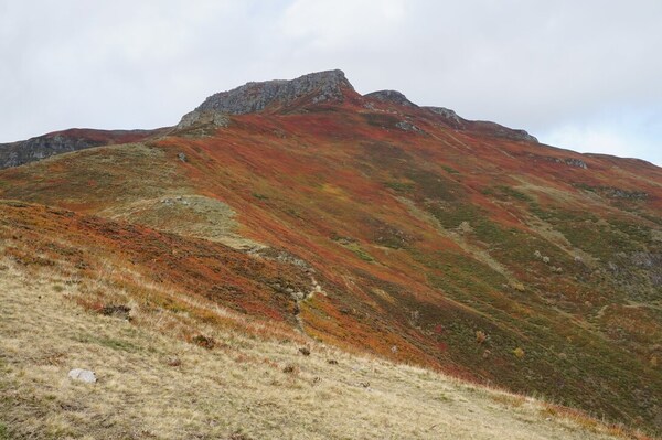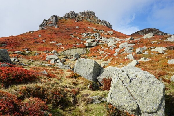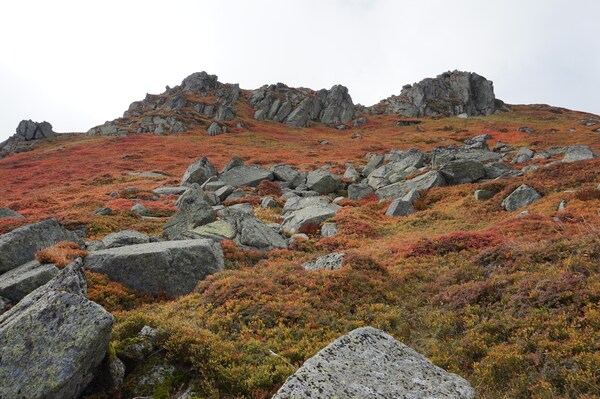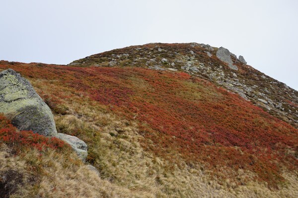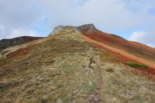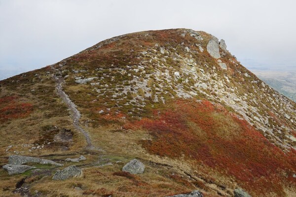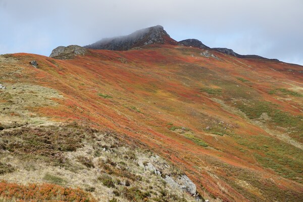Le sentier contourne le sommet. Ces tons rouges des myrtilliers