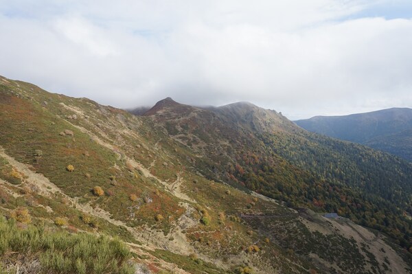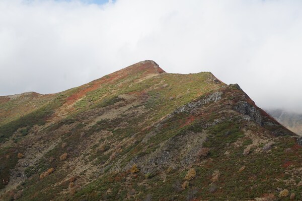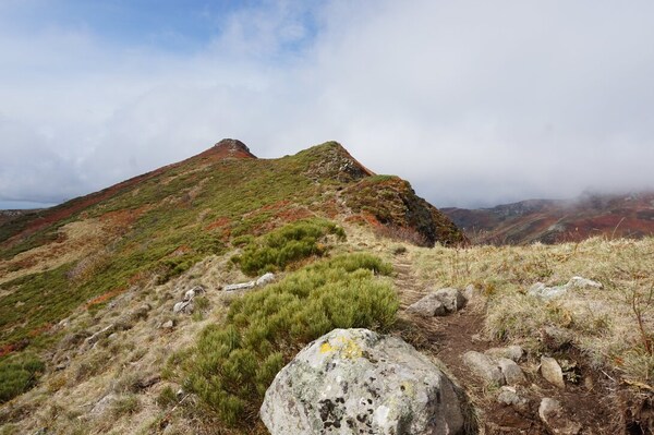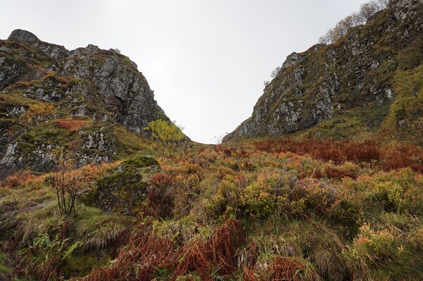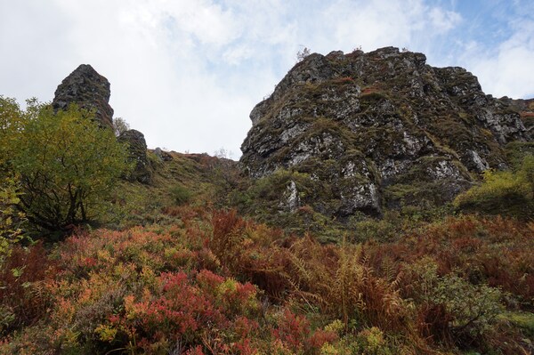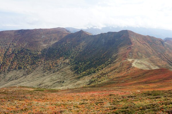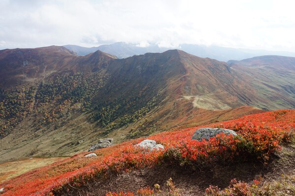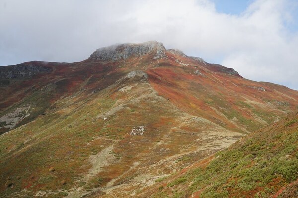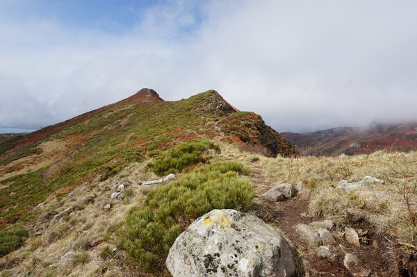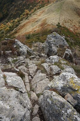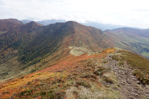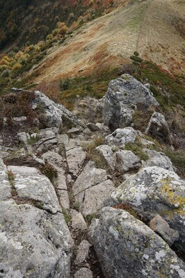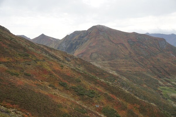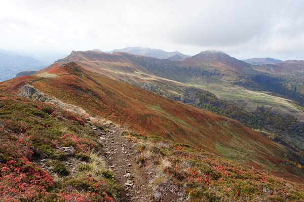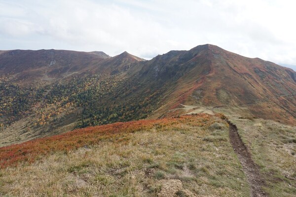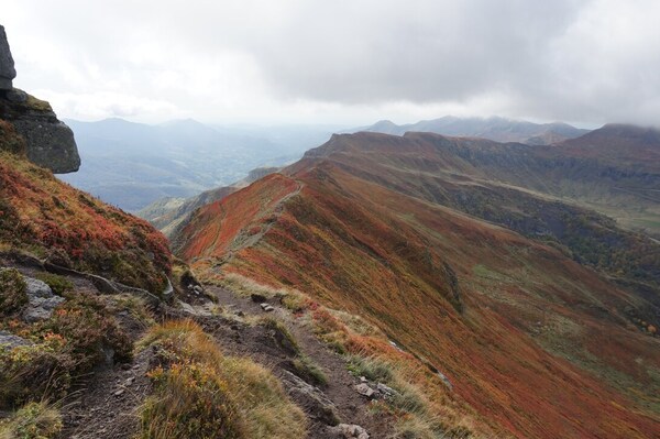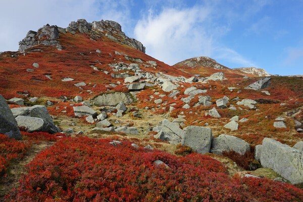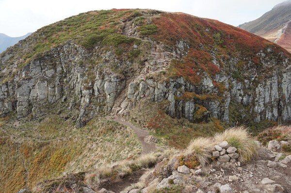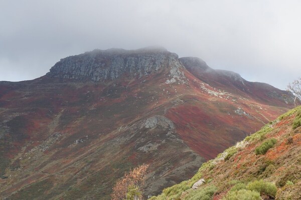 Le sentier contourne le sommet. Ces tons rouges des myrtilliers