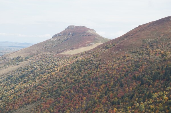 Gros plan sur le Puy Bataillouse au centre, le Plomb du Cantal au loin à droite,