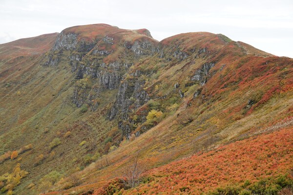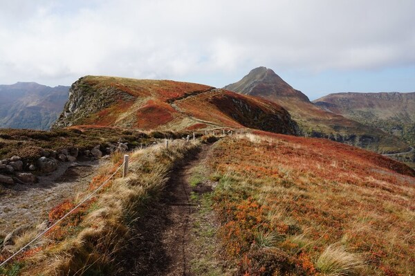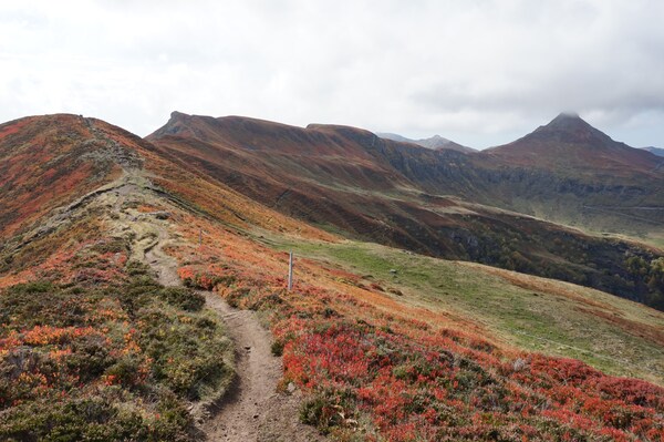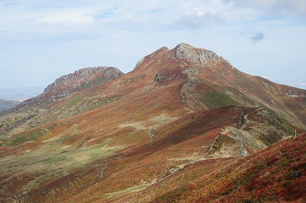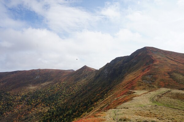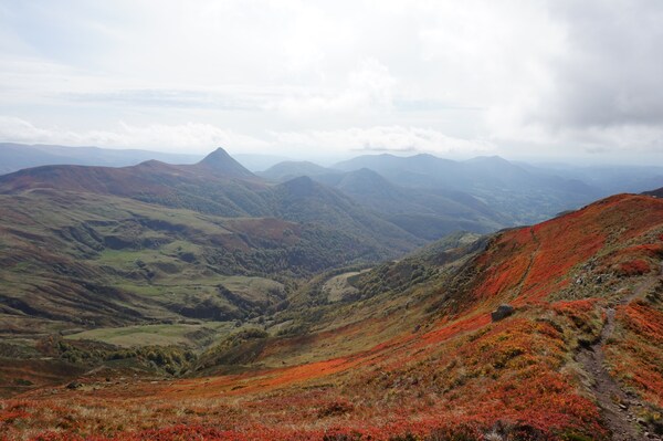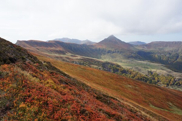 Contraste saisissant entre les tons rouges du flanc du Puy de Peyre Arse, et les