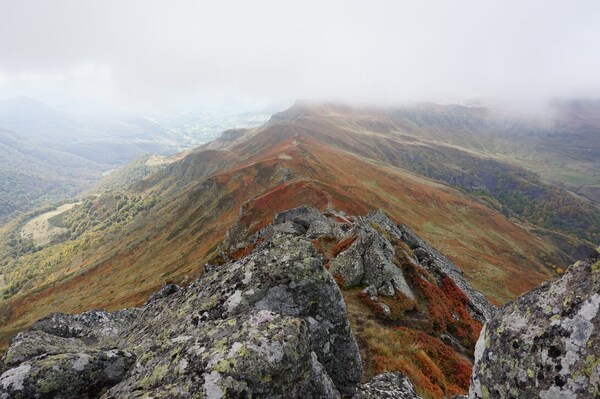 Rocher (dans les nuages), le Plomb du Cantal, le Puy Brunet (dans les nuages) et