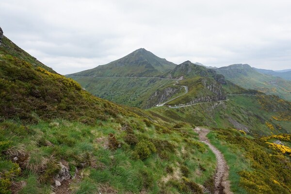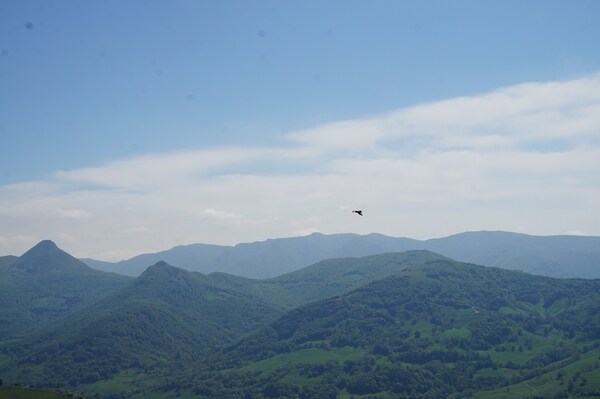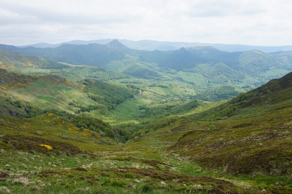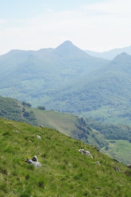 Au loin dans la brume, les silhouettes du Puy Griou et du Puy de l'Usclade