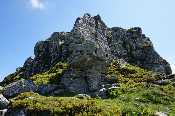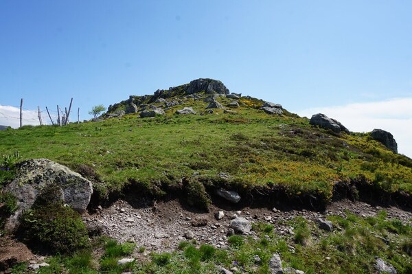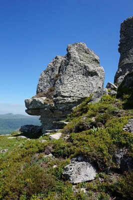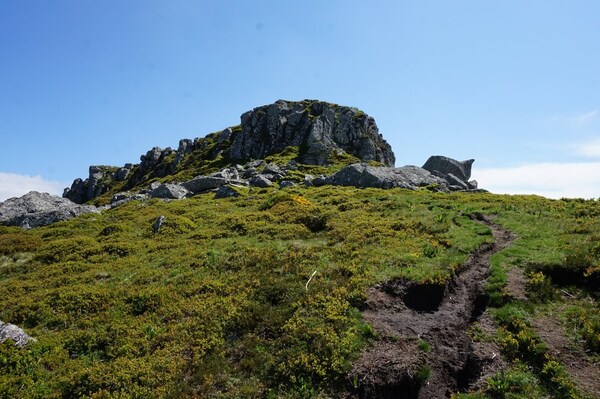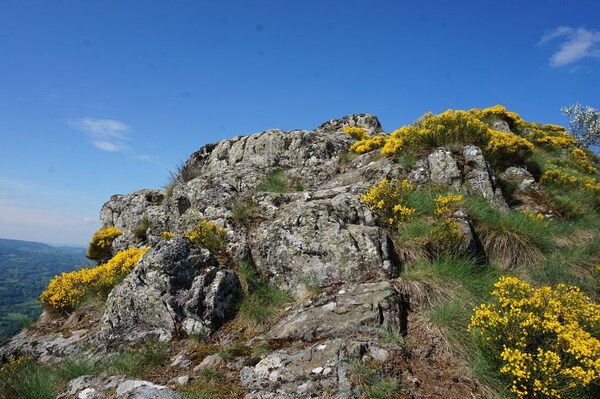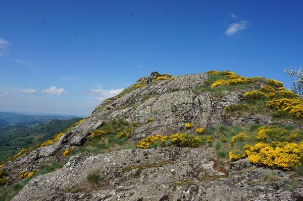 Un énorme rocher se laisse dorer au soleil. Derrière, le Puy de Bassiérou.