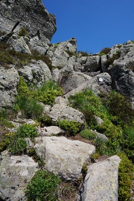 La descente commence bien, il faut se frayer un chemin entre la roche et la