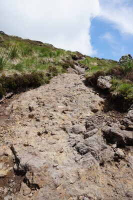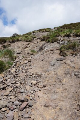 La descente est pentue. Le chemin glissant, que ce soit par l'érosion ou par les