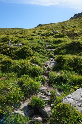 La pente du chemin descendant vers le lac des Gardes est tout simplement
