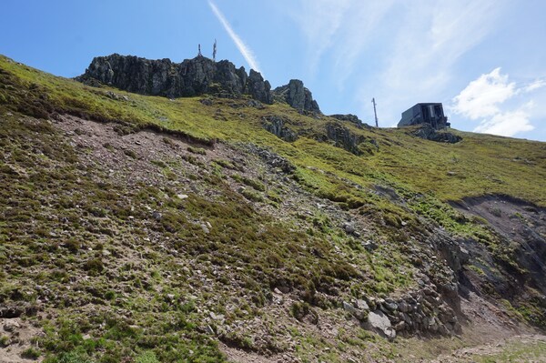 Les antennes du bâtiment de transmissions, et la gare d'arrivée du téléphérique.