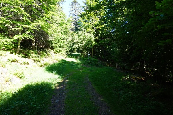 Le chemin s'élève tranquillement en forêt. En juillet et août, je vous invite à