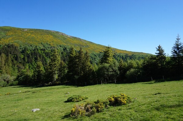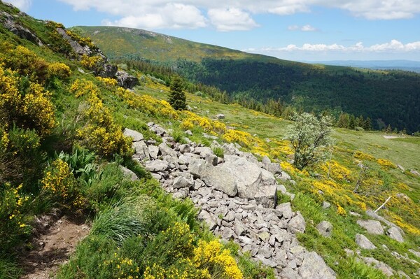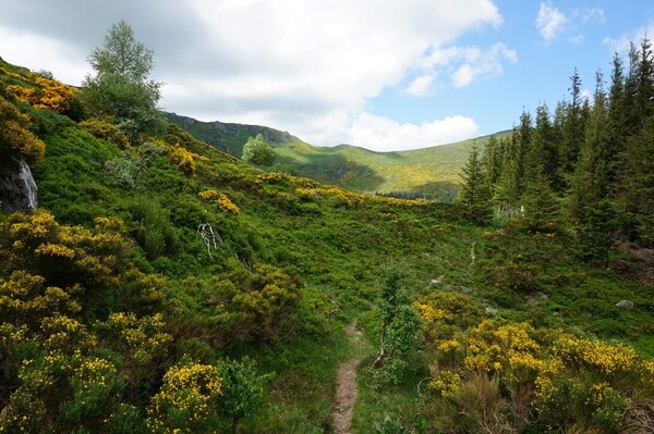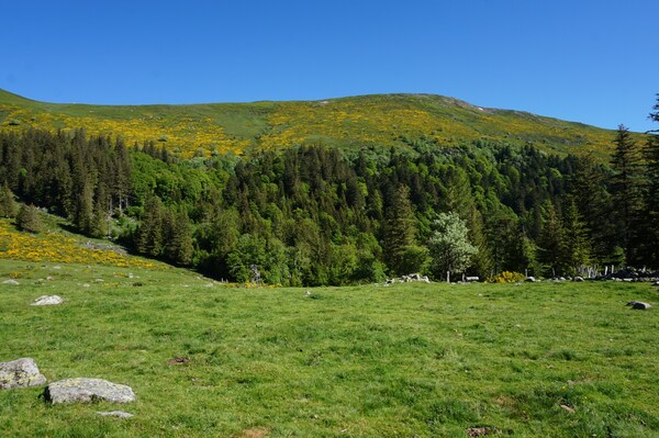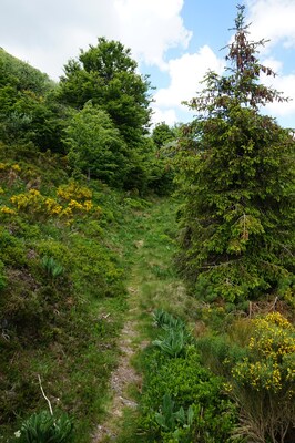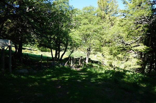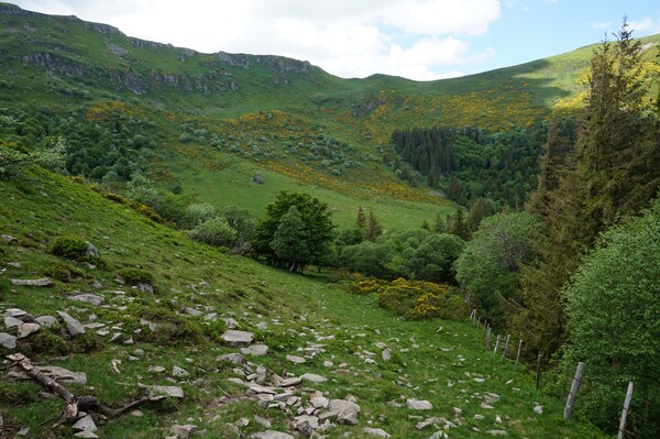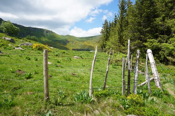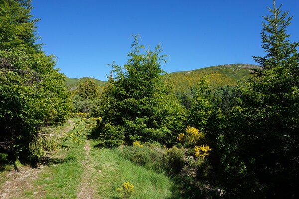 Après avoir longé le buron, le chemin descend doucement en longeant la forêt