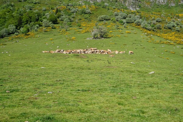 centre, le troupeau de vaches à l'estive qui paresse parce qu'il est encore tôt.