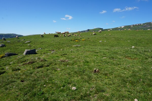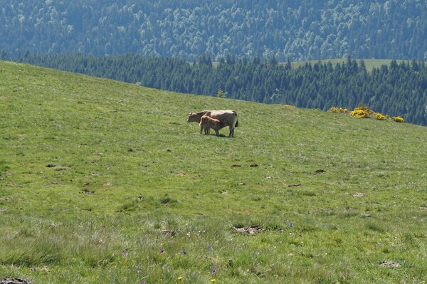 Quelques vaches et le sommet du Rocher de la Sagne du Porc, au loin.