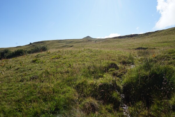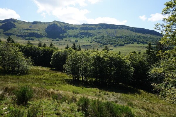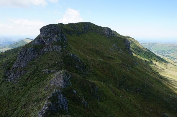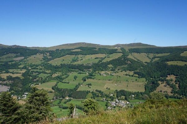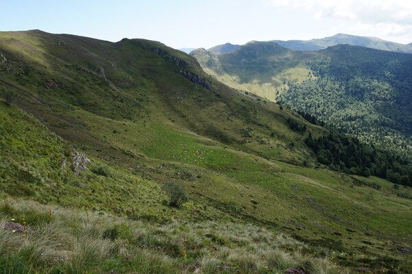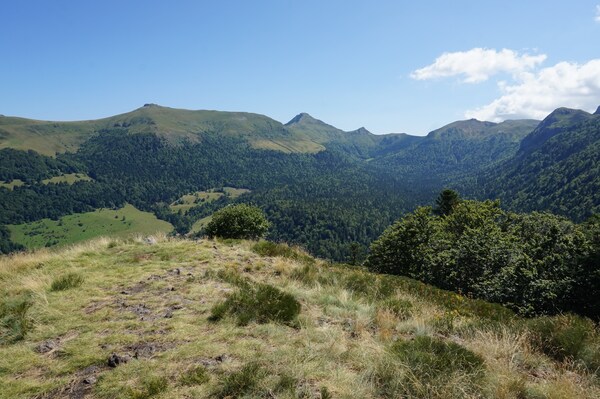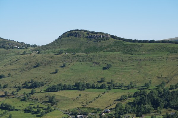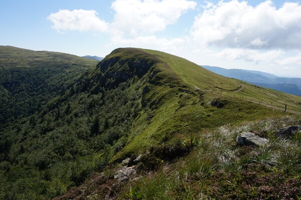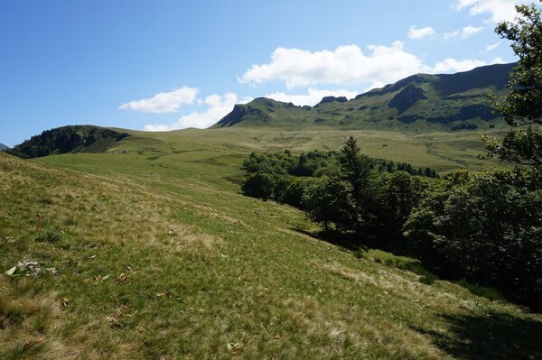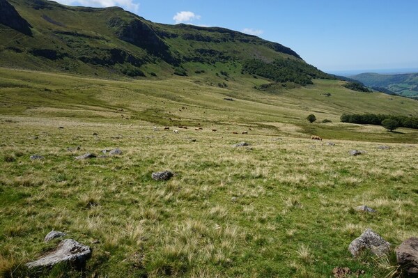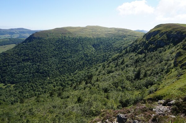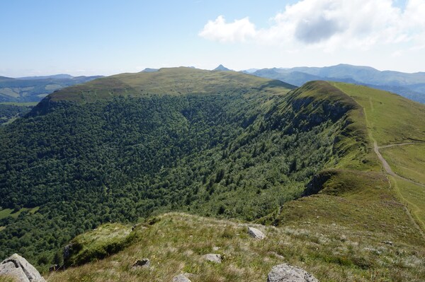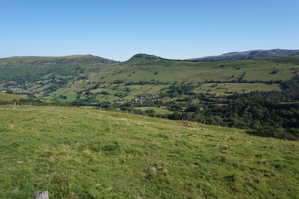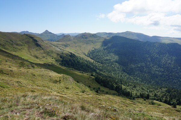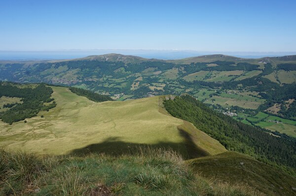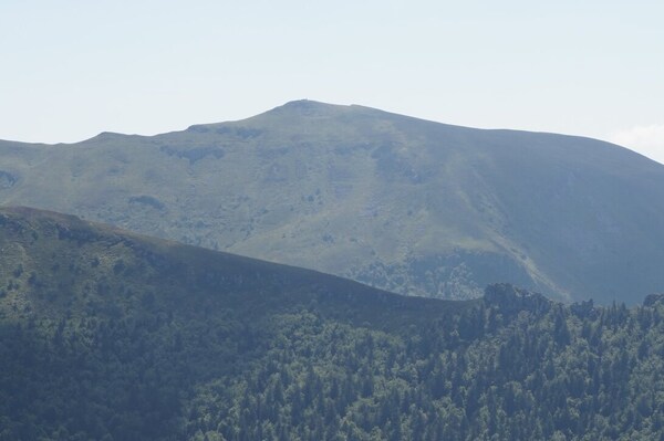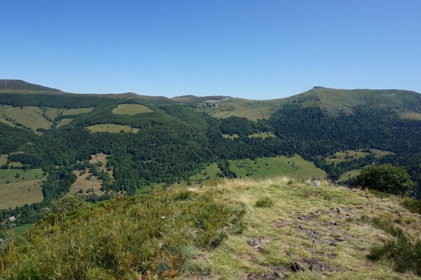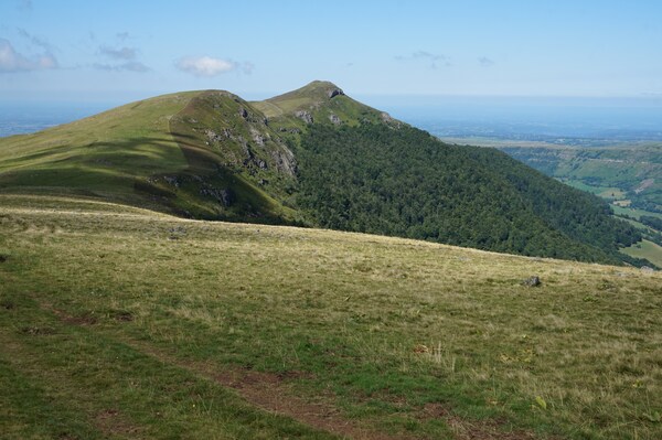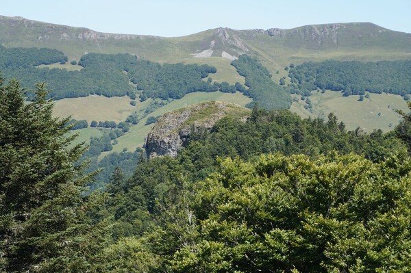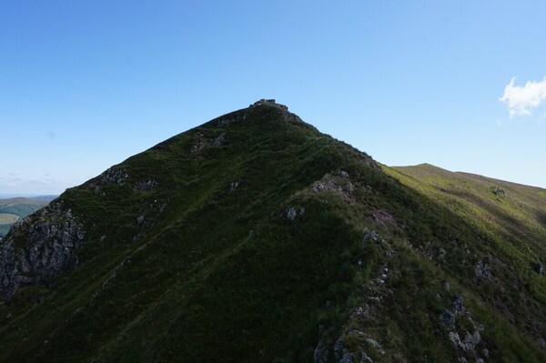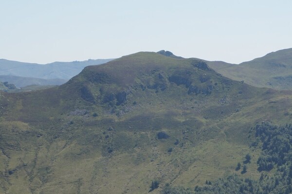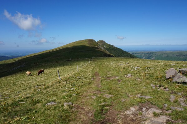 Chapeloune à l'arrière plan, la bosse arrondie du Plomb du Cantal est facilement