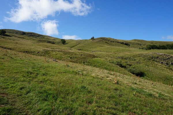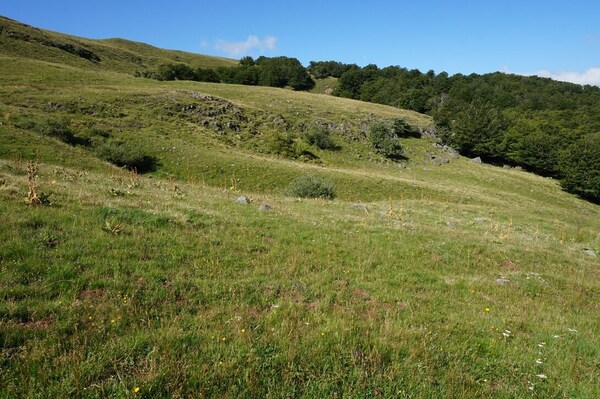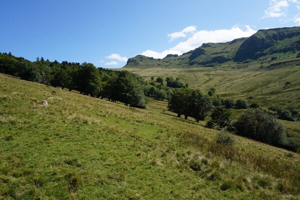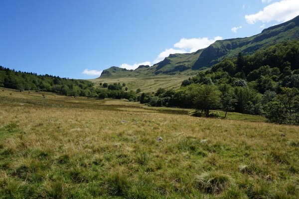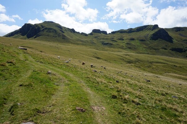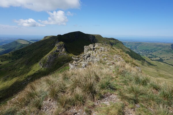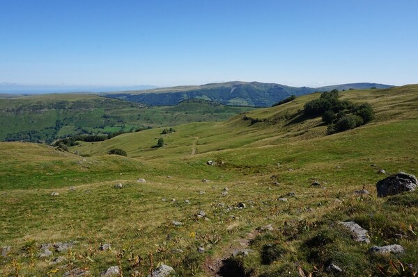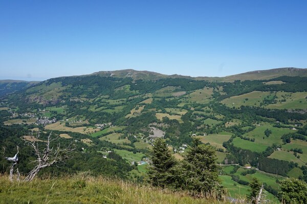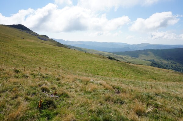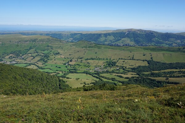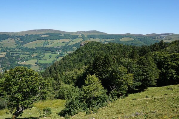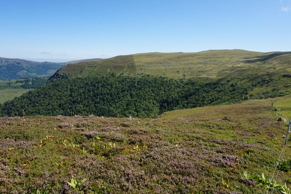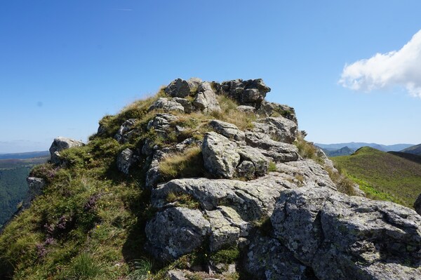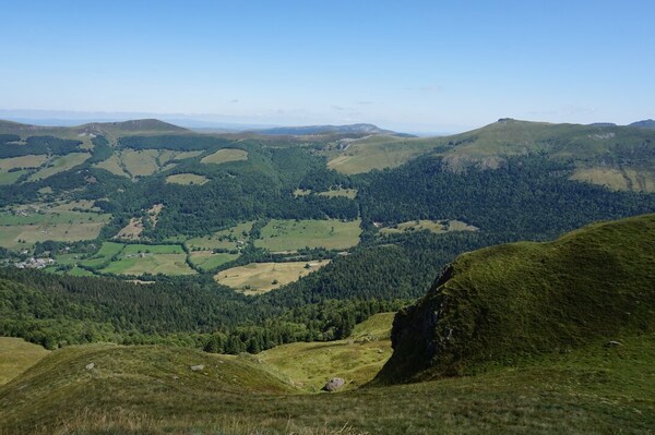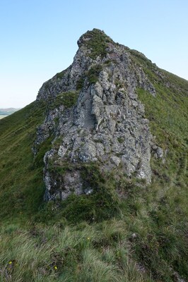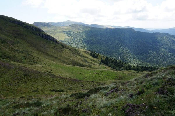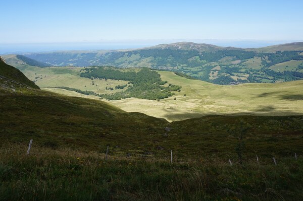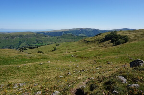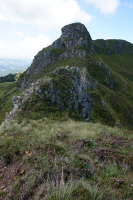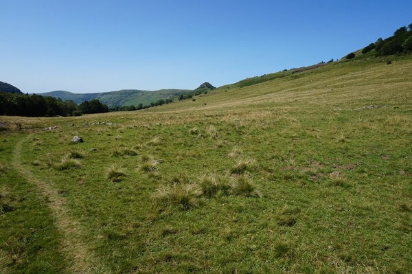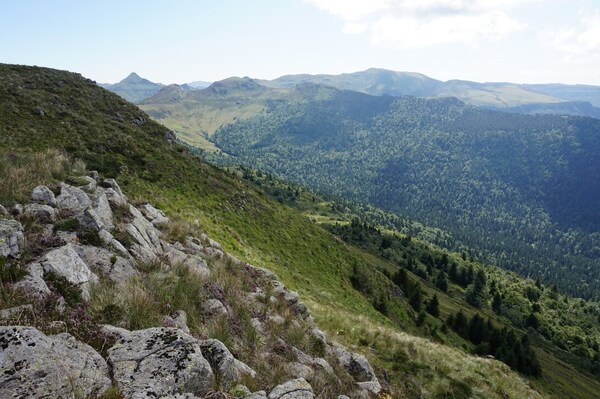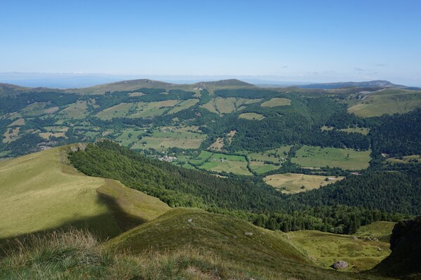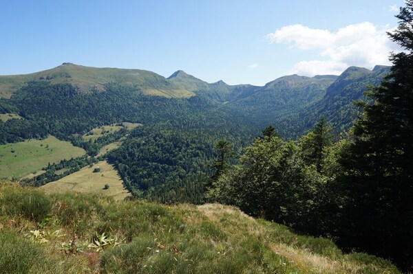 Chapeloune à l'arrière plan, la bosse arrondie du Plomb du Cantal est facilement