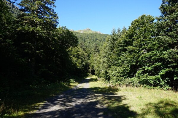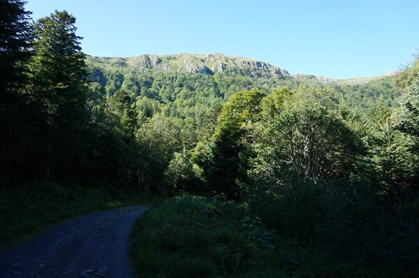 Le chemin vers le Roc du Merle se dirige vers la forêt. Notez le Puy de la