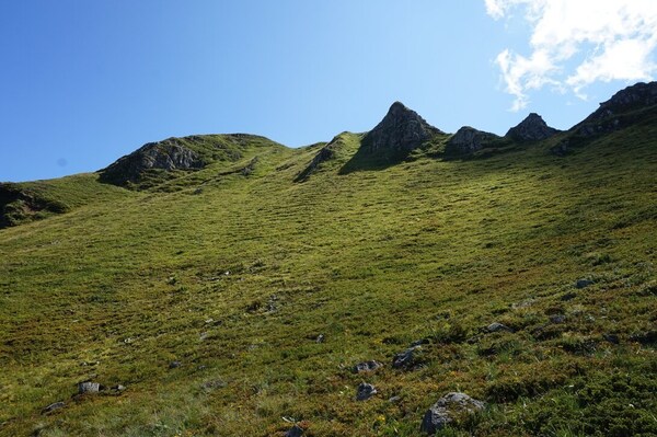 Depuis ce sommet intermédiaire, le Puy Mary réapparaît, et l'on distingue un