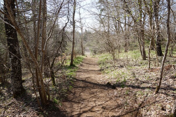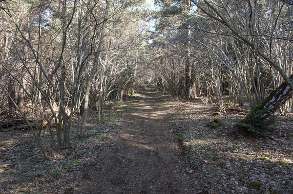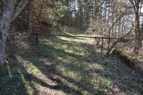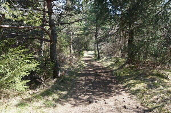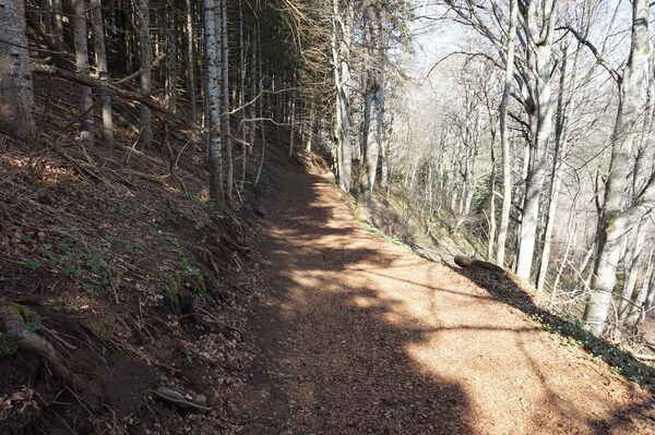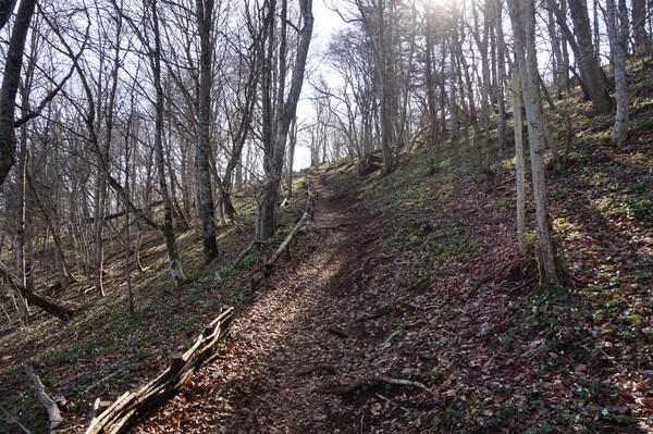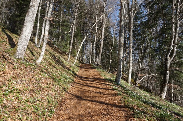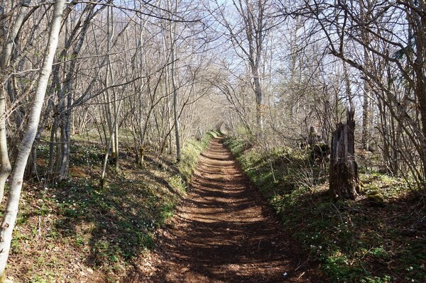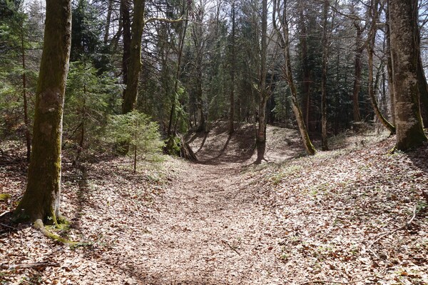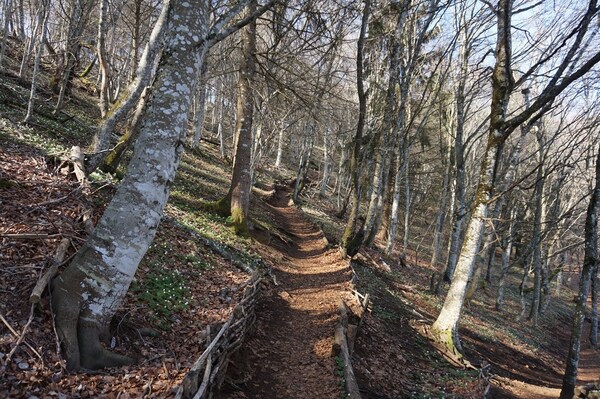 Après une courte montée, le chemin traverse une zone boisée.