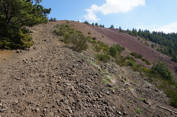 chemin, il s'agit plutôt d'une plage de scories, pentue et glissante, et peu