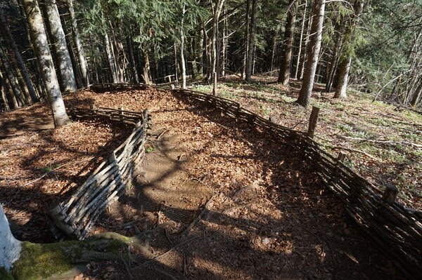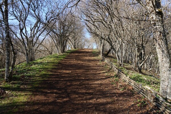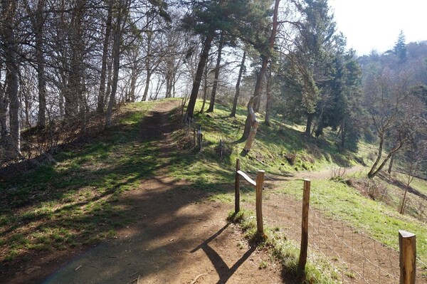 Le sentier monte en lacets à travers des barrières en noisetier.