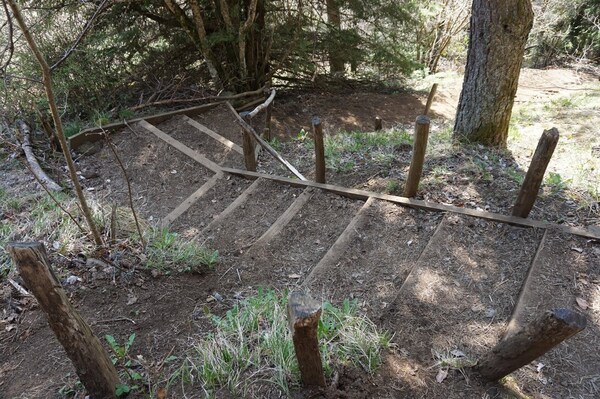 Juste après avoir traversé, un petit escalier au sommet duquel se trouve un
