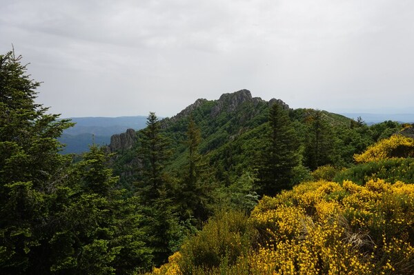 Bauzon (plus sombre et plus près), le Gerbier de Jonc, le Suc d'Ourseyre et le