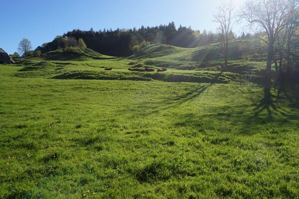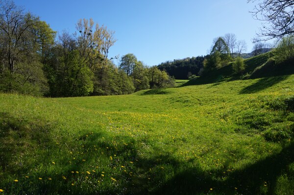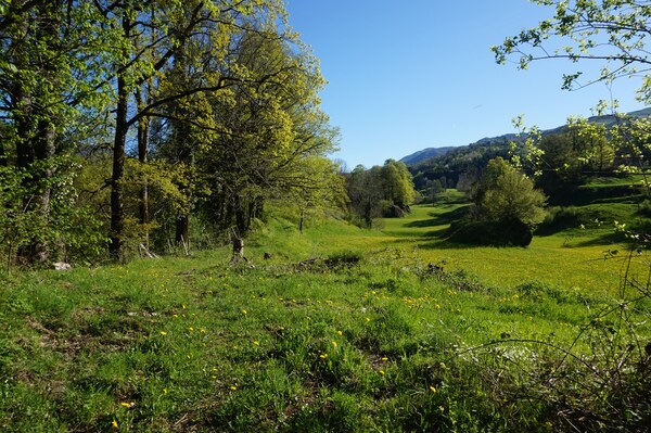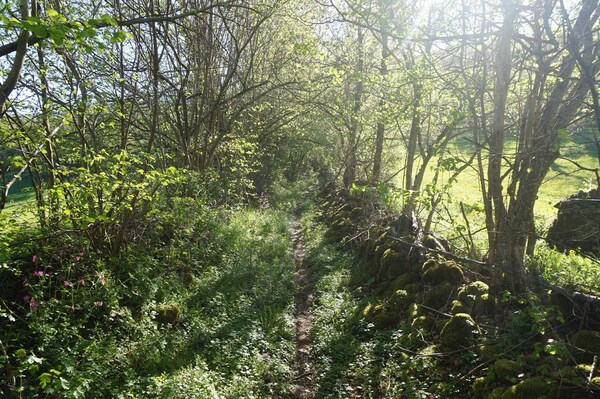 Je me retrouve au milieu d'une prairie bucolique. Le chemin, peu marqué, part