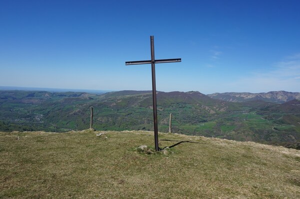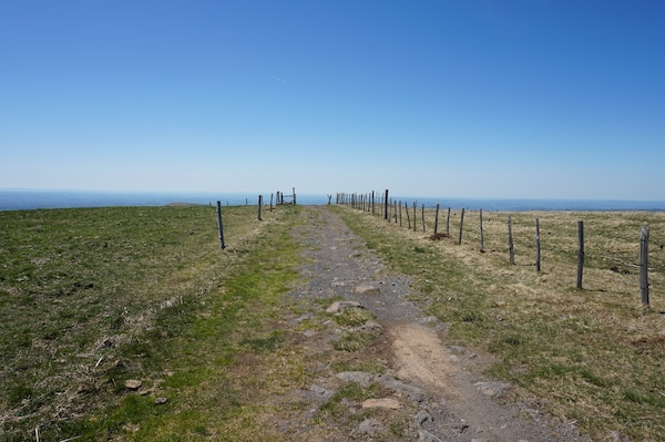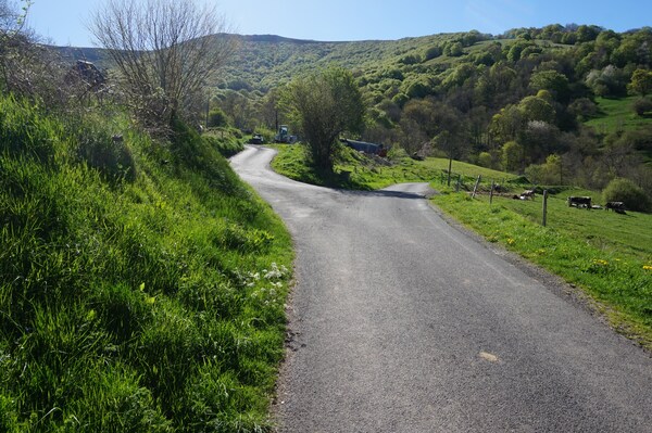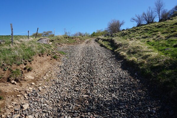 Je rejoins une route goudronnée qui continue à descendre. Devant moi, le Puy de