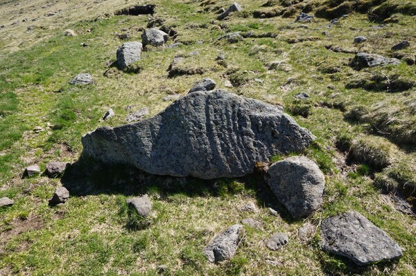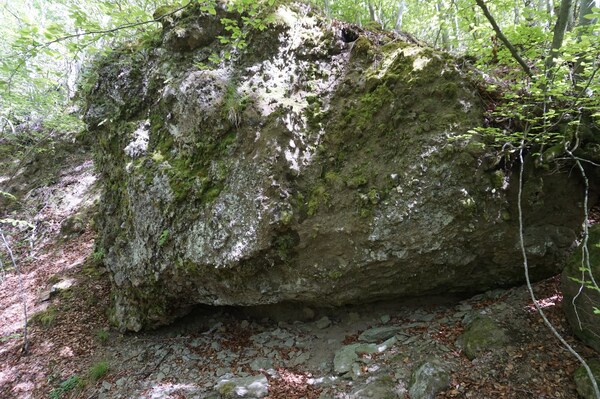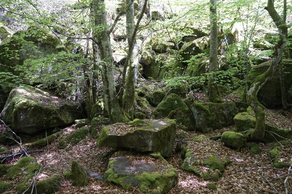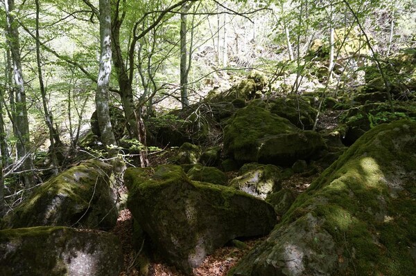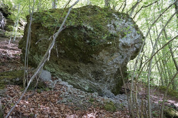 À proximité du chemin, des blocs rocheux de toutes tailles, recouverts de