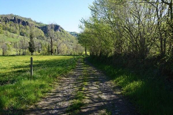 Le chemin débouche sur une route goudronnée, avec la première maison de