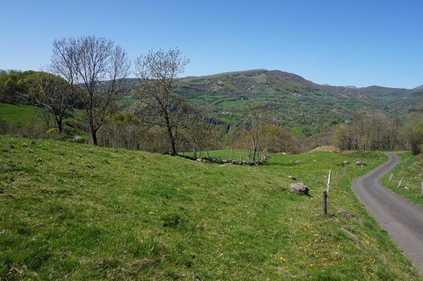 La route qui redescend vers la Goutte et Thiézac croise, à gauche, la route de