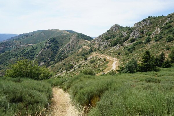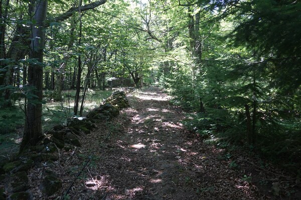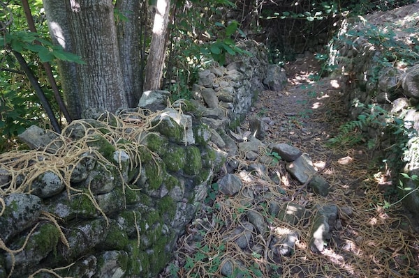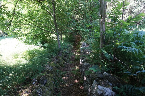 Le chemin se faufile entre des murs de pierres sèches qui délimitent les