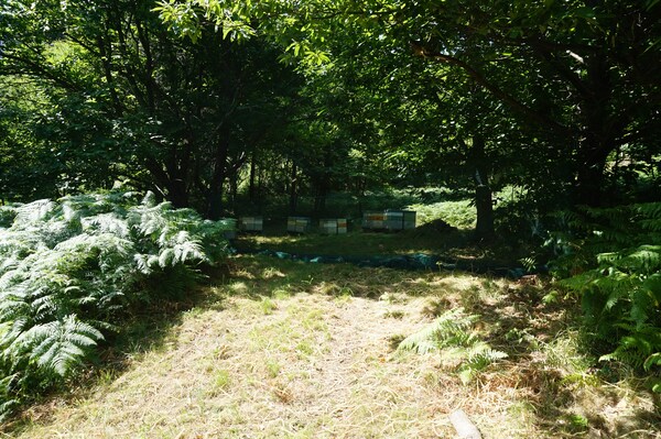 Le chemin longe ces quelques ruches. Les filets, qui d'ordinaire servent à