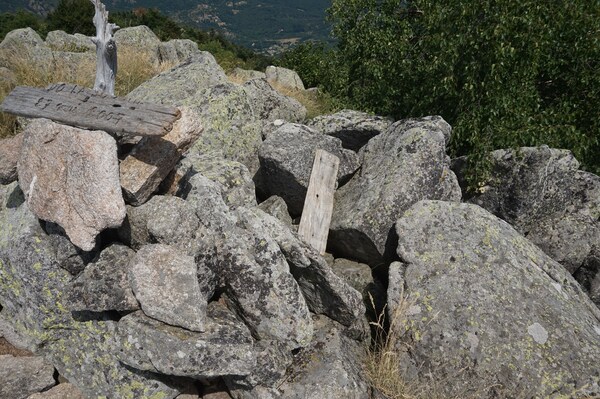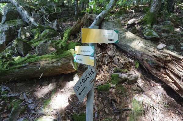 Le panneau indicateur au col gît au sol, sans doute victime d'une insolation.