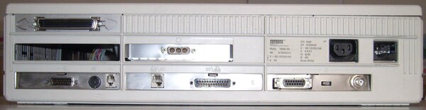 | Remote keyboard and mouse cable (male DB15 connector), local mouse (mini-DIN) and keyboard (4P4C `RJ9') connectors | Console or printer port (MMJ), modem or printer port (DE25 female RS232) | Ethernet connector: either 10base5 (AUI) or 10base2 (BNC), with selector switch in-between |