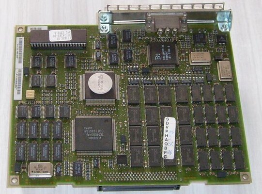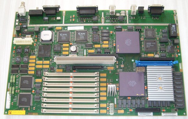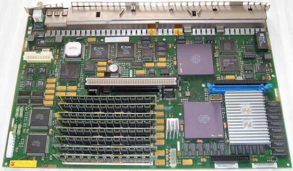 On the right, over the processor which is easy to spot with its heatsink, the blue connector is the internal SCSI connector, and the black connector next to it accepts the synchronous serial port DSW21 option.