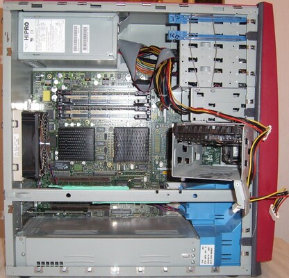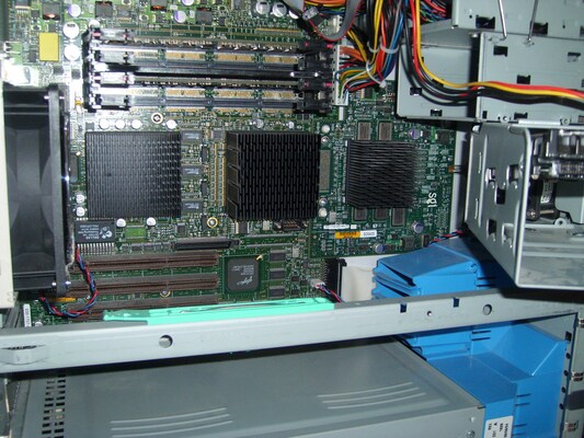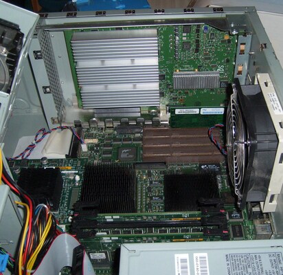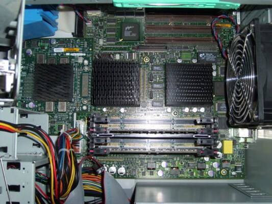 Above the heatsink row, one can notice the four memory slots. This machine has four 256MB DDR memory sticks, of which two are missing on this picture. Memory is installed in pairs of 256MB, 512MB or 1GB sticks, allowing up to 4GB of memory in the system.